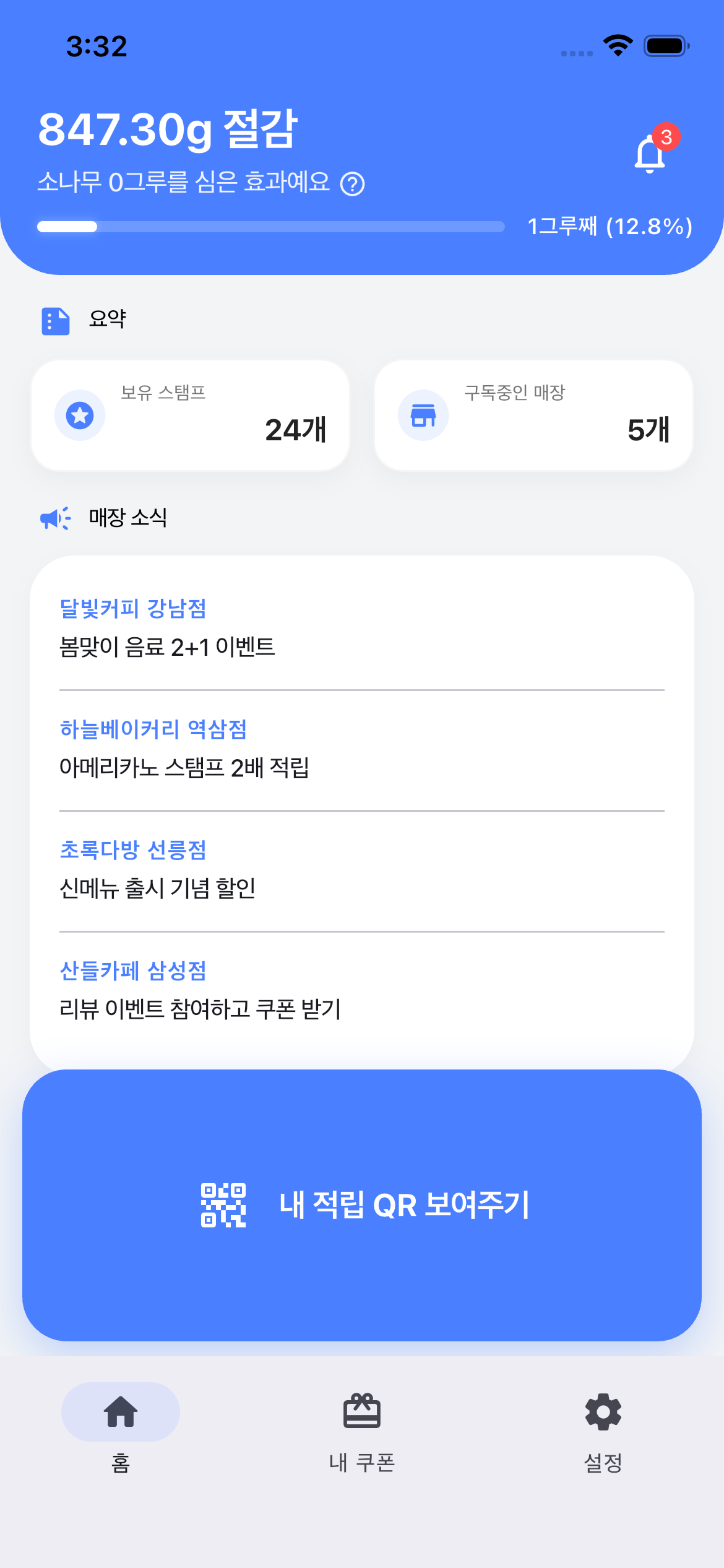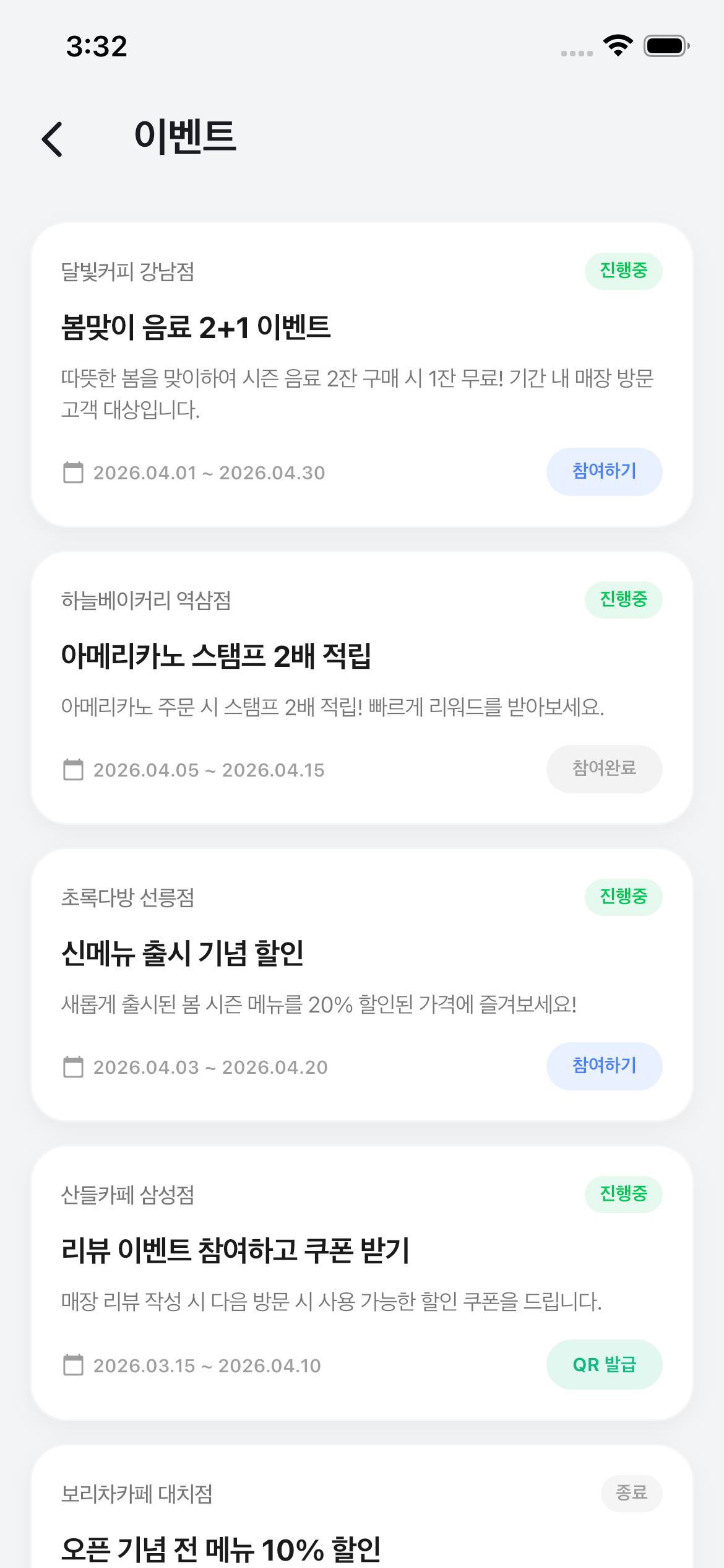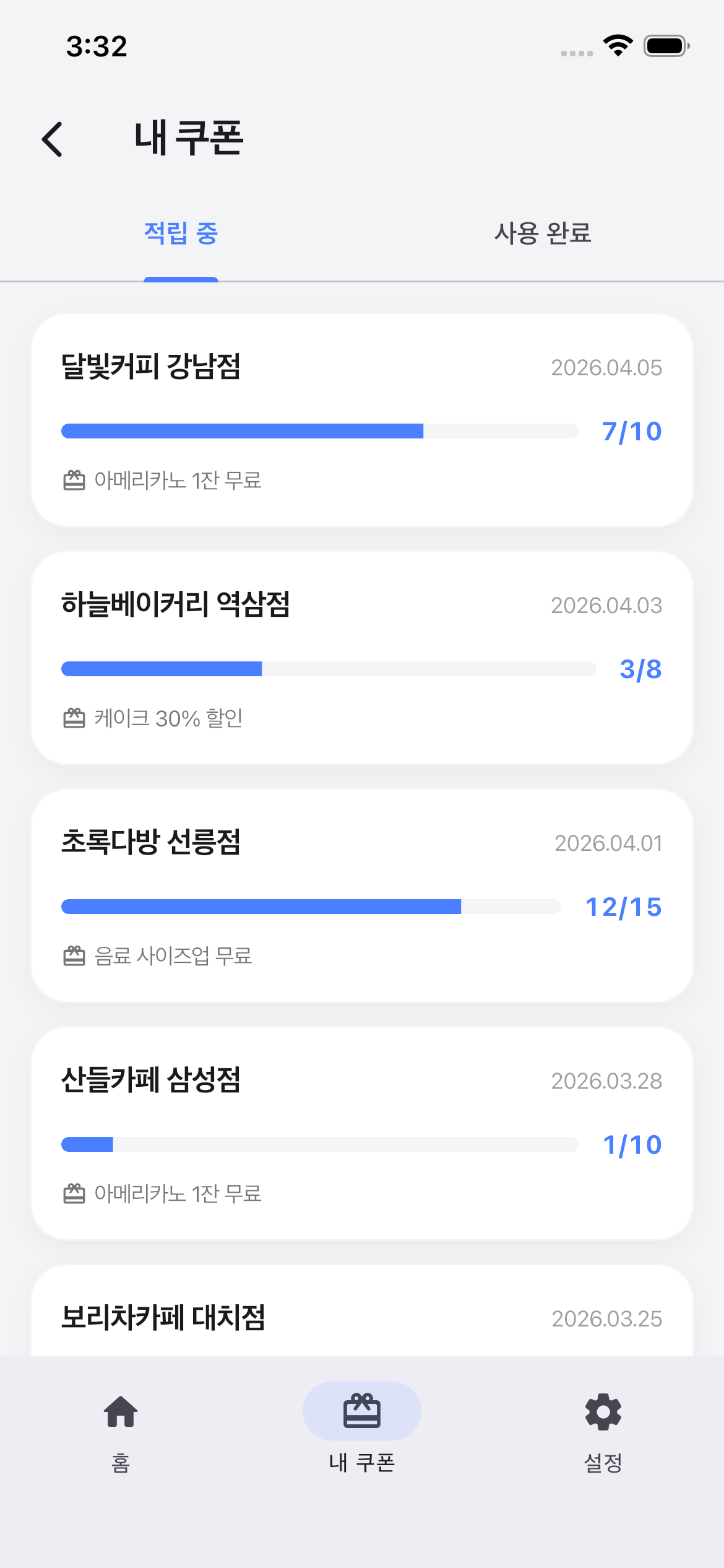 - 내 쿠폰함: 매장별 적립 현황과 보유 쿠폰 통합 관리