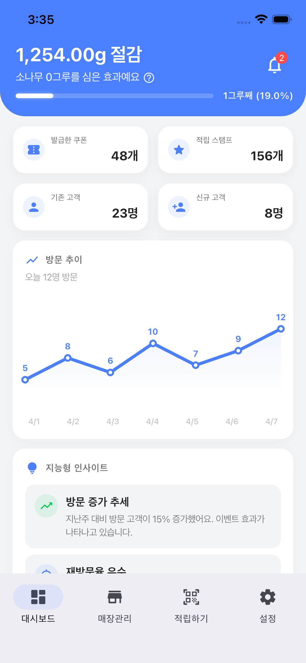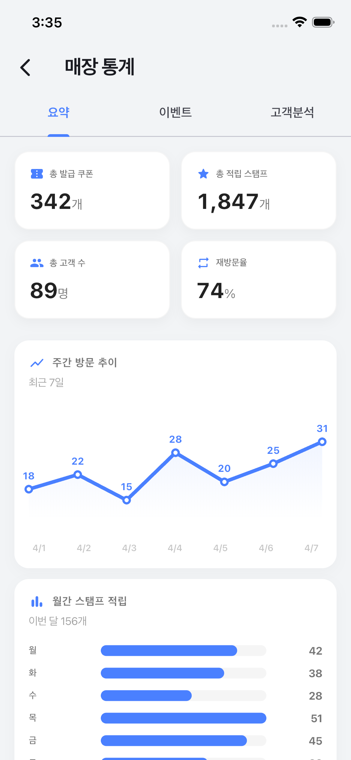 - 대시보드 & 통계: 일별/주별 방문 추이, 쿠폰 발급/사용 현황을 시각적으로 분석