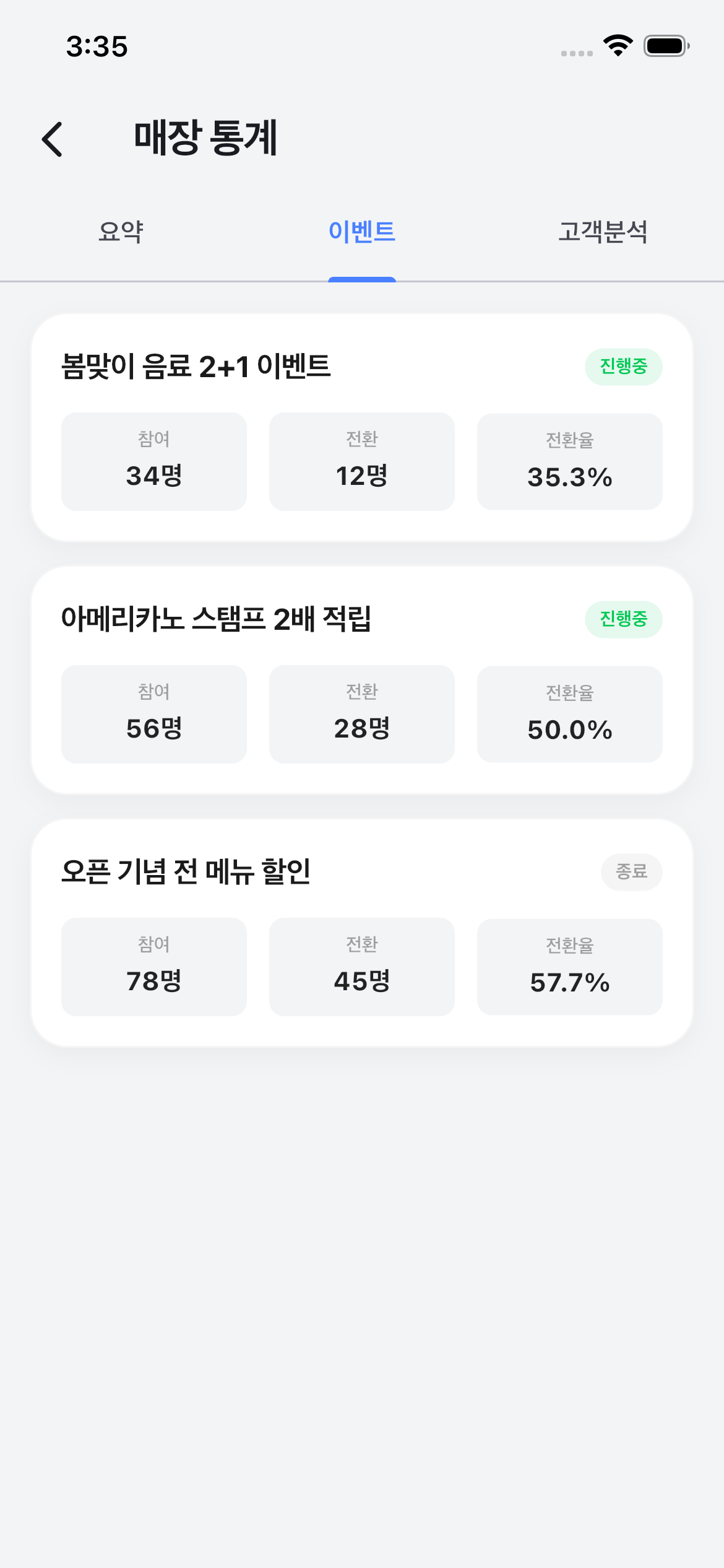 - 정책 관리: 스탬프 적립 기준 및 리워드(무료 쿠폰 등) 정책 커스텀 설정