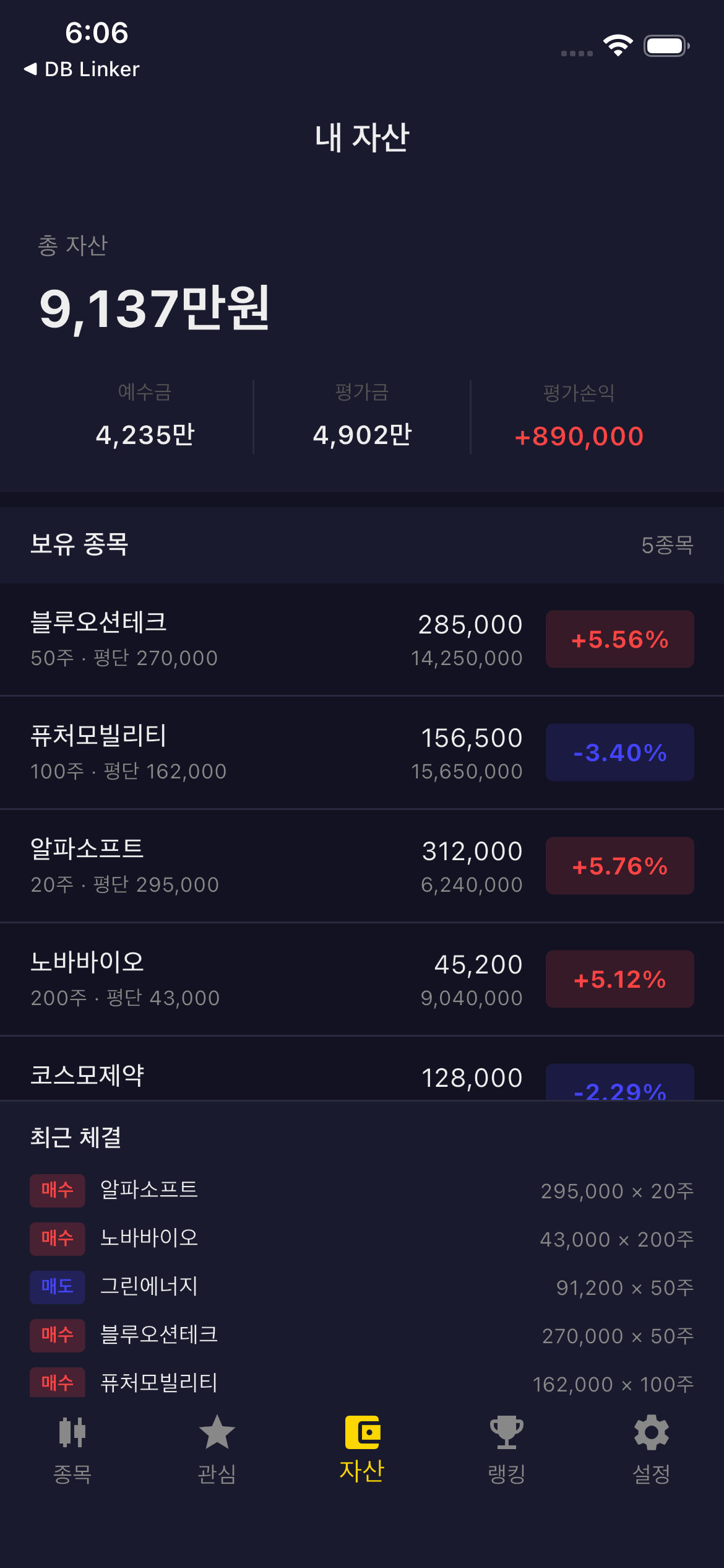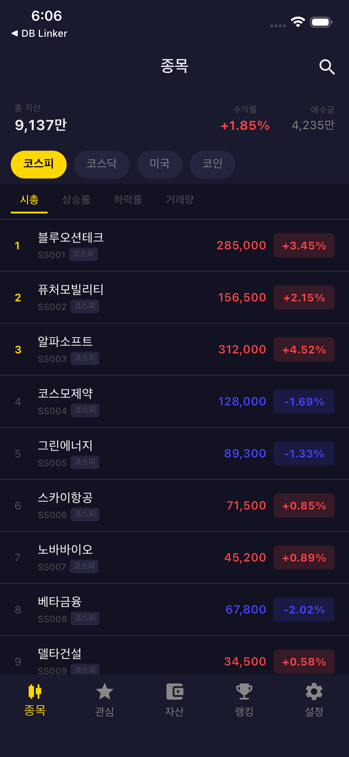 │ ├── home_screen.dart # 하단 네비 (종목/관심/자산/랭킹/설정)