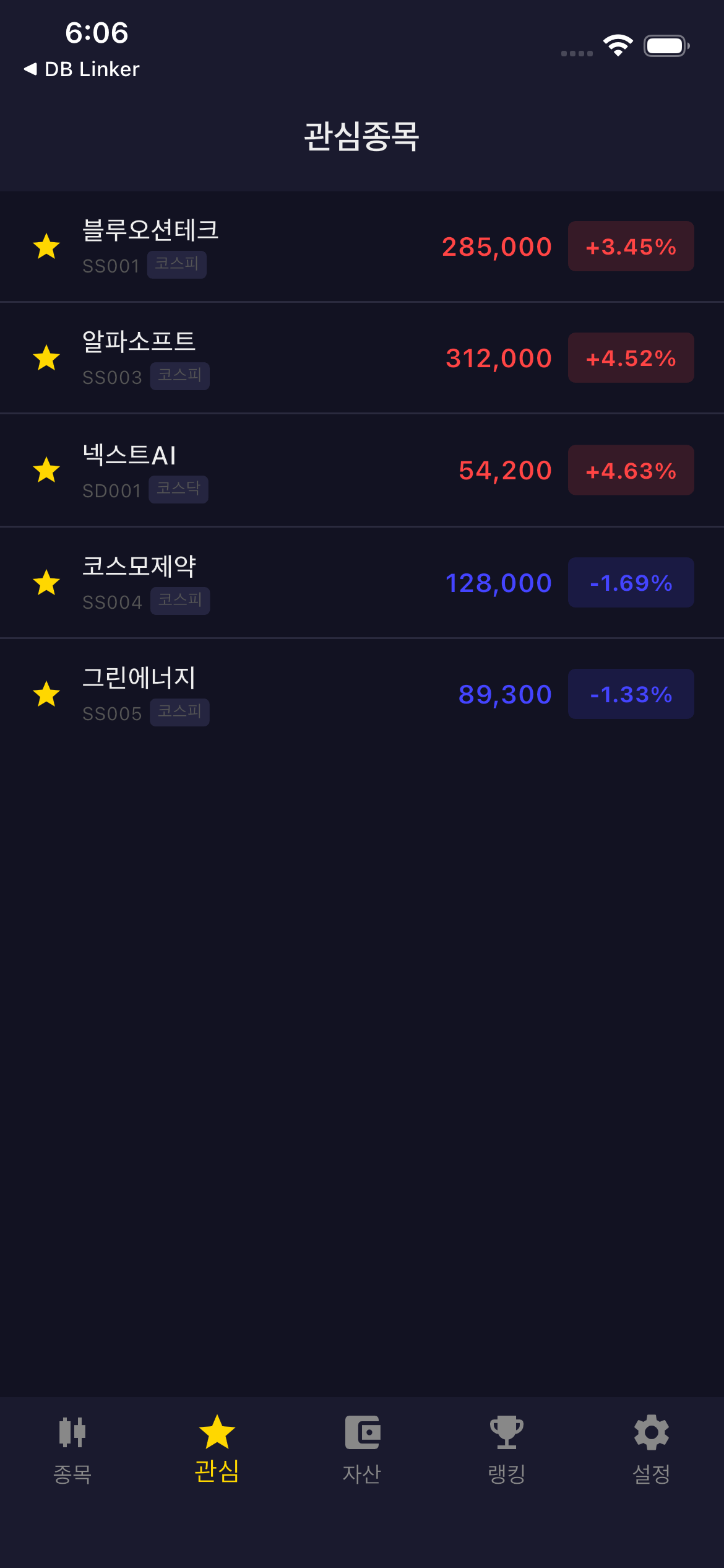 - 종목 상세 화면에서 ★ 버튼으로 관심종목 추가/삭제